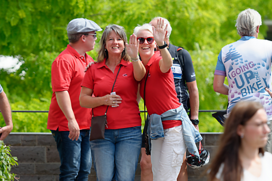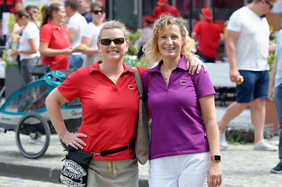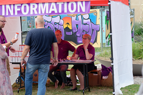 In roten und lila T-Shirts standen unsere Mitarbeiter*innen den zahlreichen Besucher*innen als Ansprechpartner*innen zur Verfügung und sorgten für einen reibungslosen Ablauf des Events.
