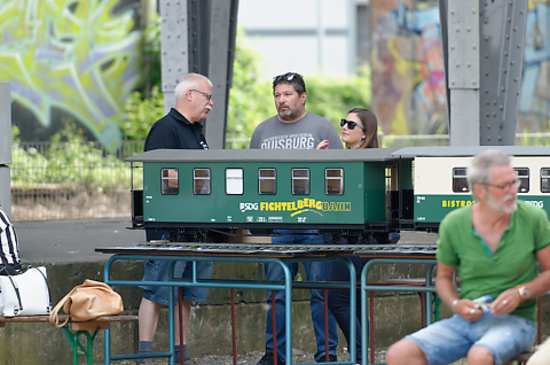 Einer unserer Kollegen ist begeisterer Eisenbahn-Modellbauer. Seinen Zug mit Anhänger stellte er am alten Bahnhof aus und fand viele interessierte Gesprächspartner*innen.
